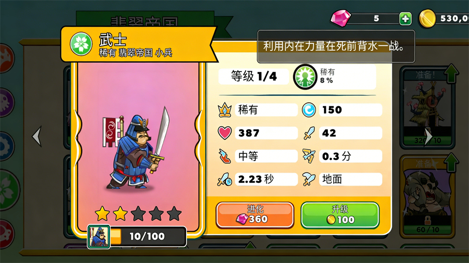 2、进入战斗后,右下角会不断地积累神力,你可以通过消耗神力来召唤英雄和小兵