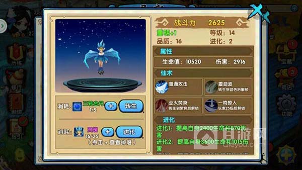 打开灵宠界面,点击灵宠的头像。这个时候你就可以看见灵宠的战斗力、仙术与属性栏目。灵宠的的属性主要分为生命值与伤害值。灵宠的转生与进化程度会影响到灵宠的战斗力。