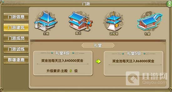 门派建筑:门派的建筑分为主殿、商店、试炼塔和礼堂,每种建筑的等级提升都依靠门派成员们的努力哦。主殿可以提升门派人数和决定其他建筑的开放,商店给门派成员提供用贡献值兑换道具和英雄灵魂石的通道,试炼塔是帮派成员专属的高产副本,而礼堂则是让你抽到手软的奖金池!
