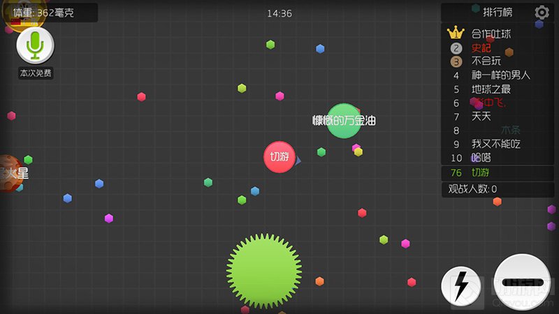 2) 实在避无可避的时候,还可以吐出精华缩小自己的体积来达到一定的加速效果,不过一定要注意好吐精华或分裂分身位置,绝对不能羊入虎口,但这是对方的体积比自己大的不会太多的情况下,如果他分裂出来的分身都比你要大,你就不容易逃脱了。