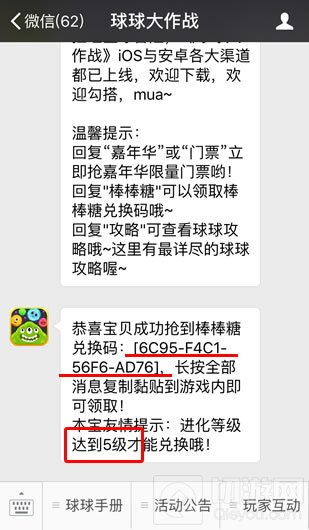 3、这个时候就会再收到一条消息,提示你领取成功。是一组16位的数字+字母形式的验证码。不过需要特别注意的是:只有球球大作战进化等级达到5级的玩家,才可以兑换这个二维码哦。