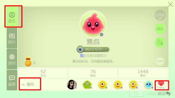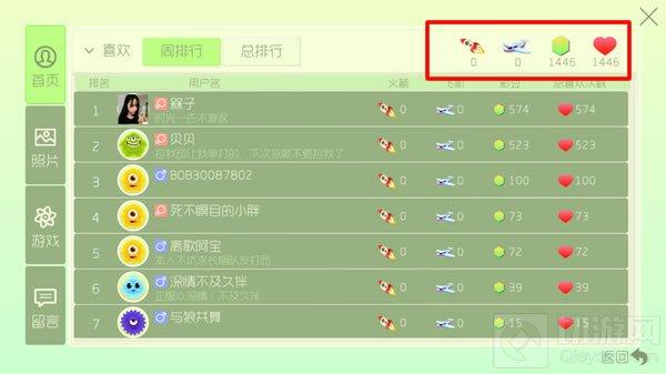 3、在这里包含四个部分,分别是首页、照片、游戏、以及留言,大家只需在首页的左下角点击喜欢,即可弹出送礼物的窗口,在这里你可以看到他的粉丝所送的礼物,可以送火箭、飞机、彩豆和桃心。
