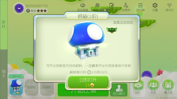 在主界面的左下角,大家会看到这里有三个宝箱栏,只有到一定的等级才能解锁这些宝箱栏。小编现在只是解锁了第一个哦,而且每隔三个小时就可以打开宝箱一次,也可以用一定数量的金针菇来打开。宝箱里面可以开出各种圣衣合成材料,还有一定概率开出光环或者孢子皮肤哦。