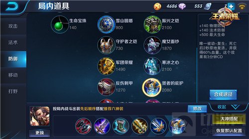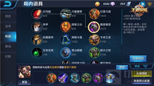 出装:第1件推荐直接红莲斗篷,非常平滑的装备,基本是肉的第一选择装备;第2件还是破灭君主;第3件根据对面阵容选择影忍之足或是抵抗之靴;第4件出振兴之铠,这件装备的回血跟增加治疗效果能让曹操血量能源源不断地补充:第5件出霸者重装,20%的生命值恢复,并且小编测试过,不会因为受到伤害而打断,回血恐怖如斯!最后一件装备的选择可以是不详之兆或者贤者的庇护。