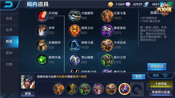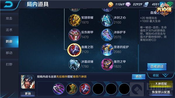 半肉型项羽的中期装备通过前期购买凶残之力合成暗影战斧,增加项羽的生命值、物理攻击、物理穿透和技能冷却CD缩短,让项羽的攻击能力更加突出,可以穿透敌方护甲对敌方造成拳拳到肉的伤害,同样选择搭配血魔之怒,这件攻防一体的装备让项羽输出能力再提高的同时让项羽的生命值得到增加,保证项羽的生存;最后鞋子依然选择影刃之足,便于项羽冲锋抵挡敌人的伤害。