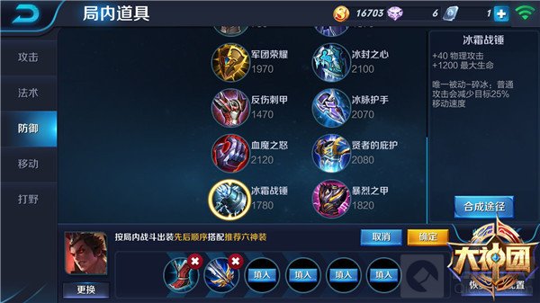 半肉型吕布的中期装备则是风暴巨剑转破军,不仅可以增加一定的物理攻击,同时更重要的是破军为吕布带来的被动。吕布的一技能,范围是很大的,尤其是附魔后的方天画戟,攻击力和范围更是大大提高,通常配合友军的攻击,两三下就可以将敌人打成残血。这时破军的被动就发挥出来了,它可以帮助吕布更好的斩杀低血量敌人。而劣势的话则是冰霜战锤,增加自身生命和物理攻击,普攻可以减少敌人的移动速度。然后鞋子选择上跟纯肉吕布一样,即冷静之靴,减少技能冷却时间,增加输出伤害。