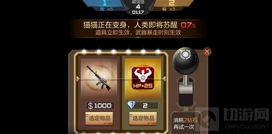 游戏中途人类将会进行一次苏醒,也可以说是一次重生吧,你也可以选择换掉系统初始给你的武器,也可以选择加血,不满意的话还可以进行一次刷新,直到你感觉满意为止,所以,刚开始游戏时你可以大胆的去找,在游戏中途还会有一次加血的机会,要注意的是,虽然猫猫们变身了,但有可能他们躲藏的位置也没变,所以在前面游戏中我们要留意观察,这样可以更利于你去找躲藏中的猫猫。