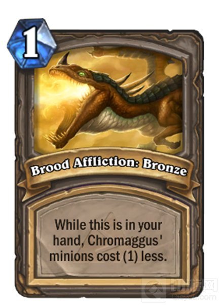龙血之痛,青铜:当这张卡牌在你的手牌时间,克洛玛古斯的随从卡消耗降低1点。英雄模式下,随从卡消耗降低3点。