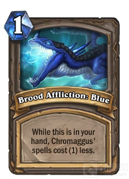 龙血之痛,蓝:当这张卡牌在你手牌时,克洛玛古斯所有法术卡牌消耗降低1点。英雄模式下,法术卡消耗降低3点。