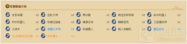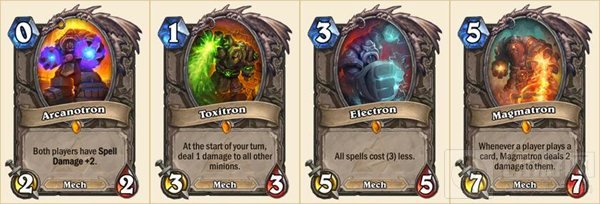 随从: 大量的机械卡牌、 钢铁武道家、机械迁越者、微型战斗机甲、奥术傀儡、工匠镇技师、熔喉等卡牌。